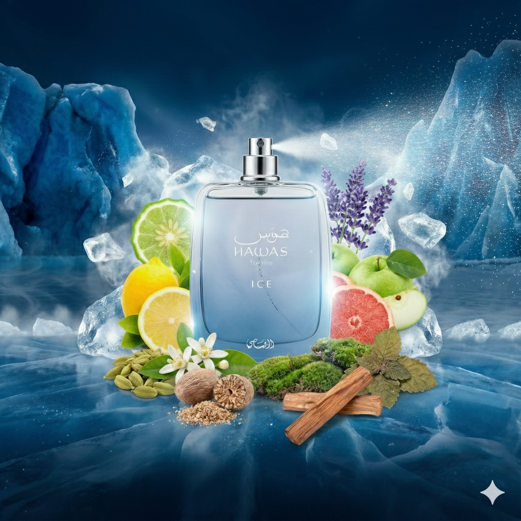 Hawas Ice de Rasasi es una explosión helada de frescura moderna, diseñada para hombres que disfrutan destacar con elegancia limpia y vibrante. Una fragancia acuática con matices cítricos que evocan un amanecer gélido sobre los fiordos australes de Magallanes.