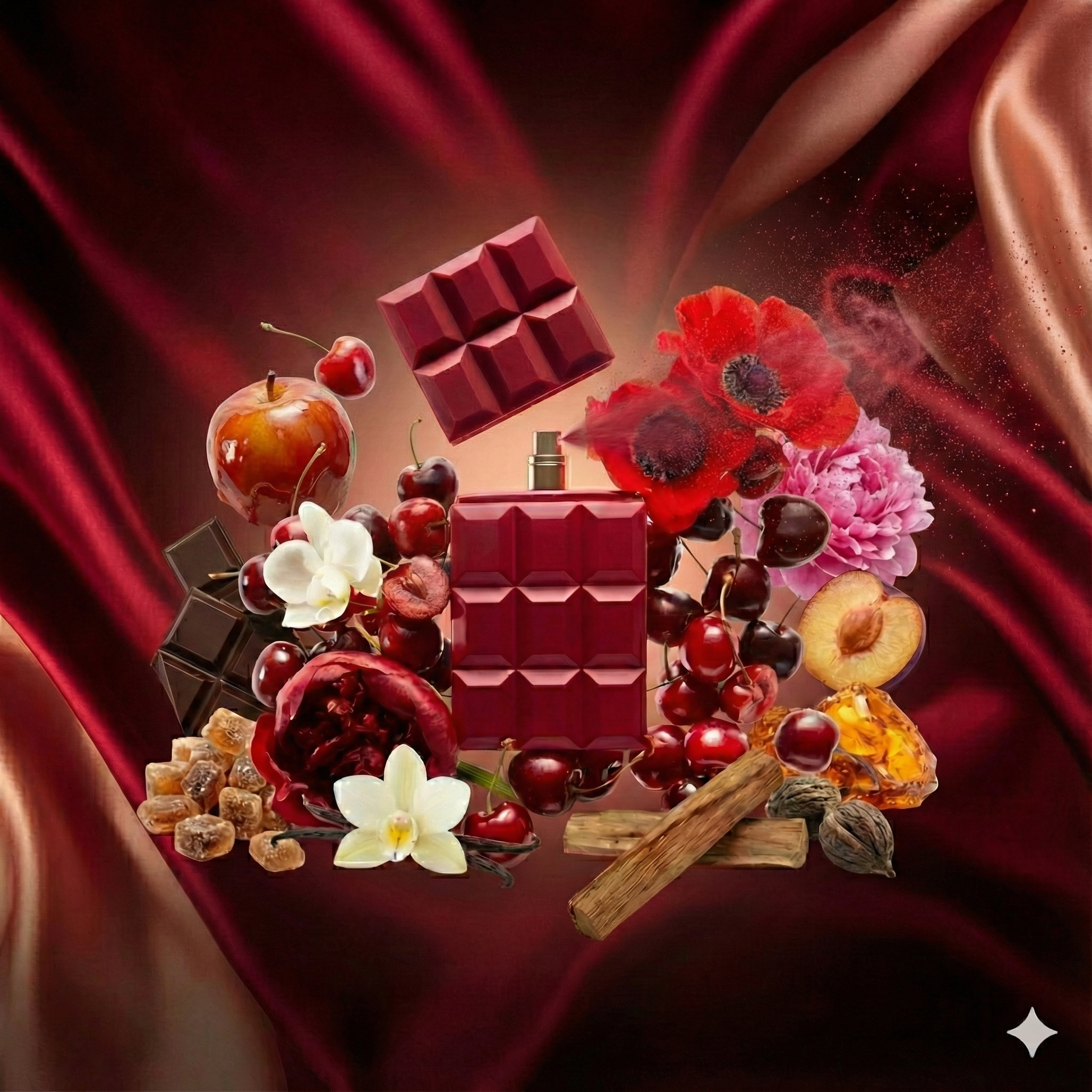 - Notas de Corazón: Amapola Roja, Flor de Peonía, Chocolate Oscuro, Orquídea Vainilla