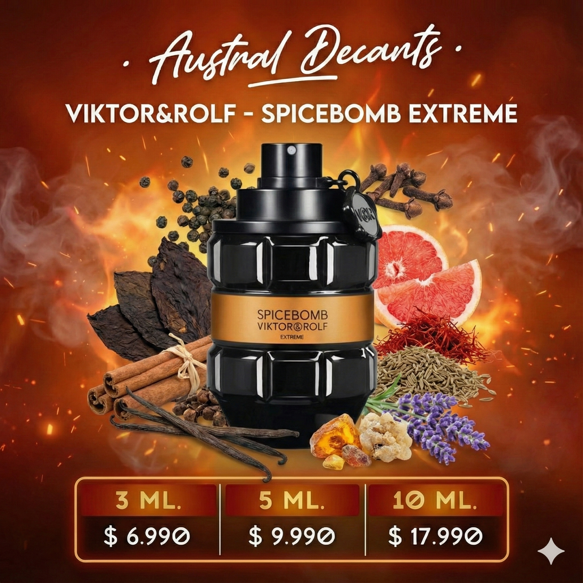 El frasco completo de Viktor & Rolf Spicebomb Extreme EDP es una inversión considerable. Nuestros decants te permiten acceder a uno de los especiados más icónicos y complimenteros del mercado sin el compromiso total. Dado su carácter potente y su longevidad extrema (12+ horas), un decant rinde muchísimo —1-2 atomizaciones son suficientes para brillar toda la noche. Perfecto para tener en tu rotación invernal, probar antes de comprometerte con la botella granada icónica, o simplemente disfrutar de uno de los mejores EDP especiados de diseñador a precio accesible.